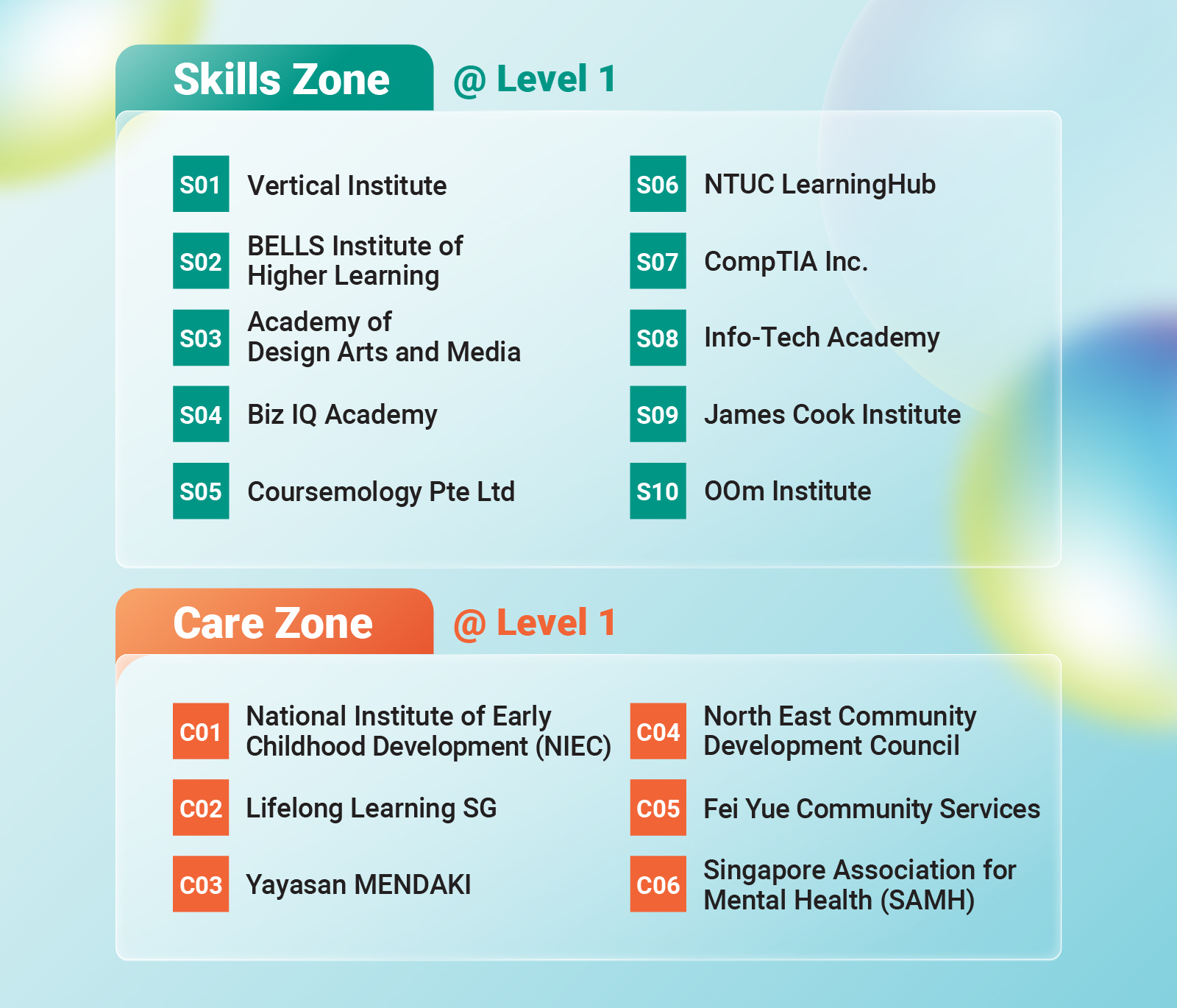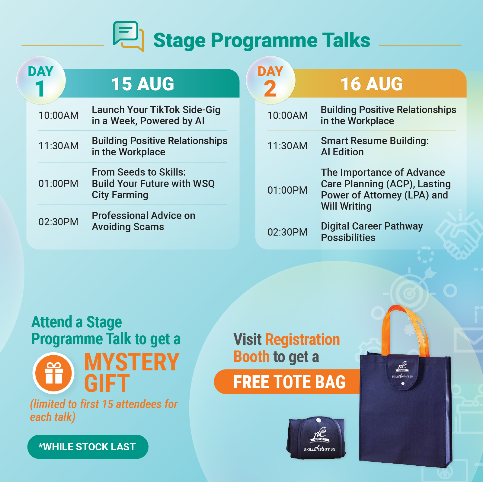 Explore SkillsFuture courses in Digital, Care, and Green sectors from 10+ training partners, plus live drone and 3D printing demos. Get guidance on mental health, work-life balance, legal planning, and financial aid to support your learning and career journey.