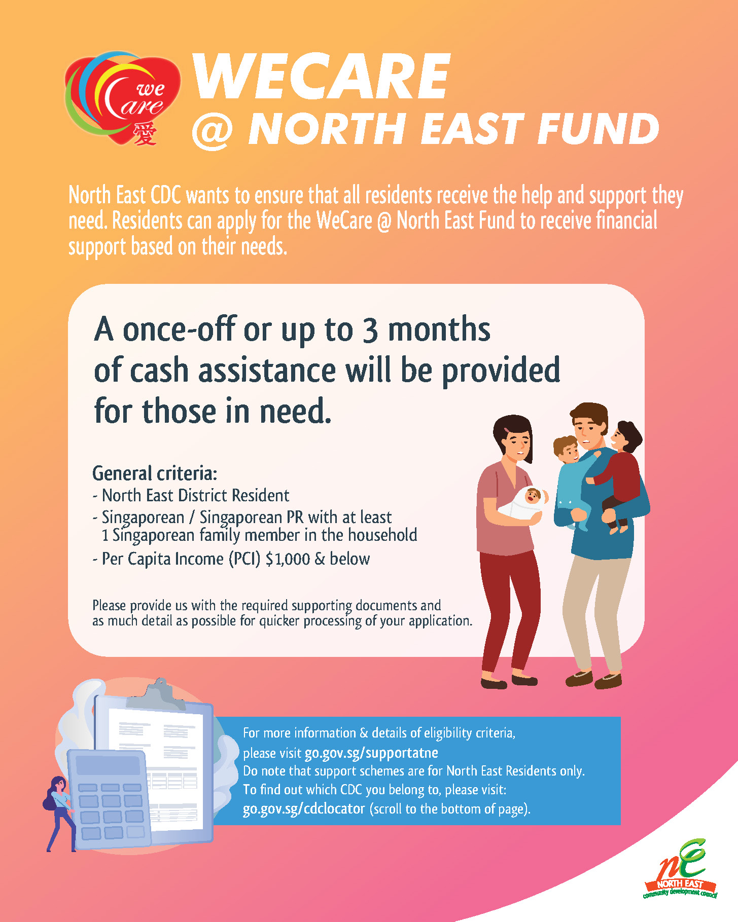 The We Care @ North East Fund aims to help needy families who require interim financial support, but do not meet the national gross household income criteria. The scheme provides assistance in the form of once-off or up to three months of cash assistance.