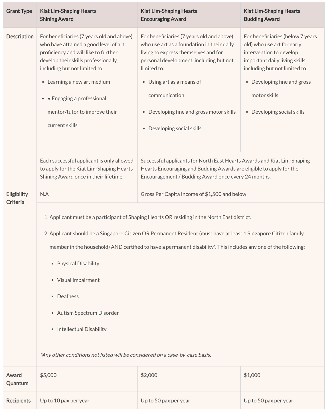 The Kiat Lim-Shaping Hearts Awards is designed to nurture artists with disabilities throughout their artistic journey, from early education to professional development. The awards consists of scholarship, bursary and early intervention grant categories to provide financial assistance for persons with disabilities to pursue art. It recognises the artistic achievements of persons with disabilities (PWDs) and aims to make art education more accessible, especially for those facing financial constraints. The awards are supported by a S$1,000,000 commitment over five years from Kiat Lim, a new patron of Shaping Hearts. The funds ensure that PWDs can access opportunities to facilitate their artistic pursuits, empowering them to explore their creativity and develop essential skills for personal growth and development.